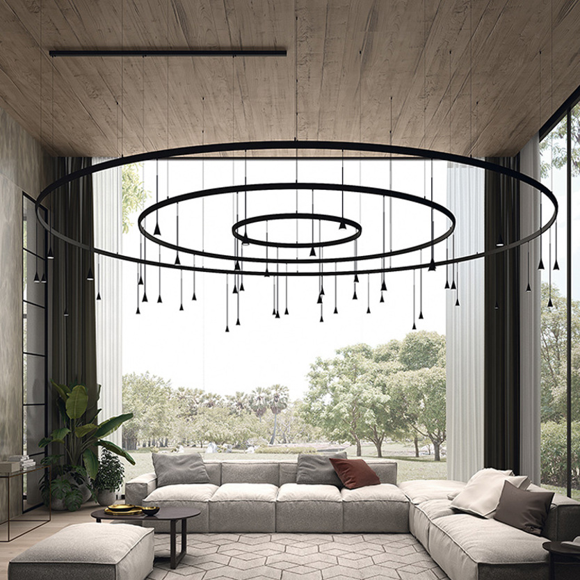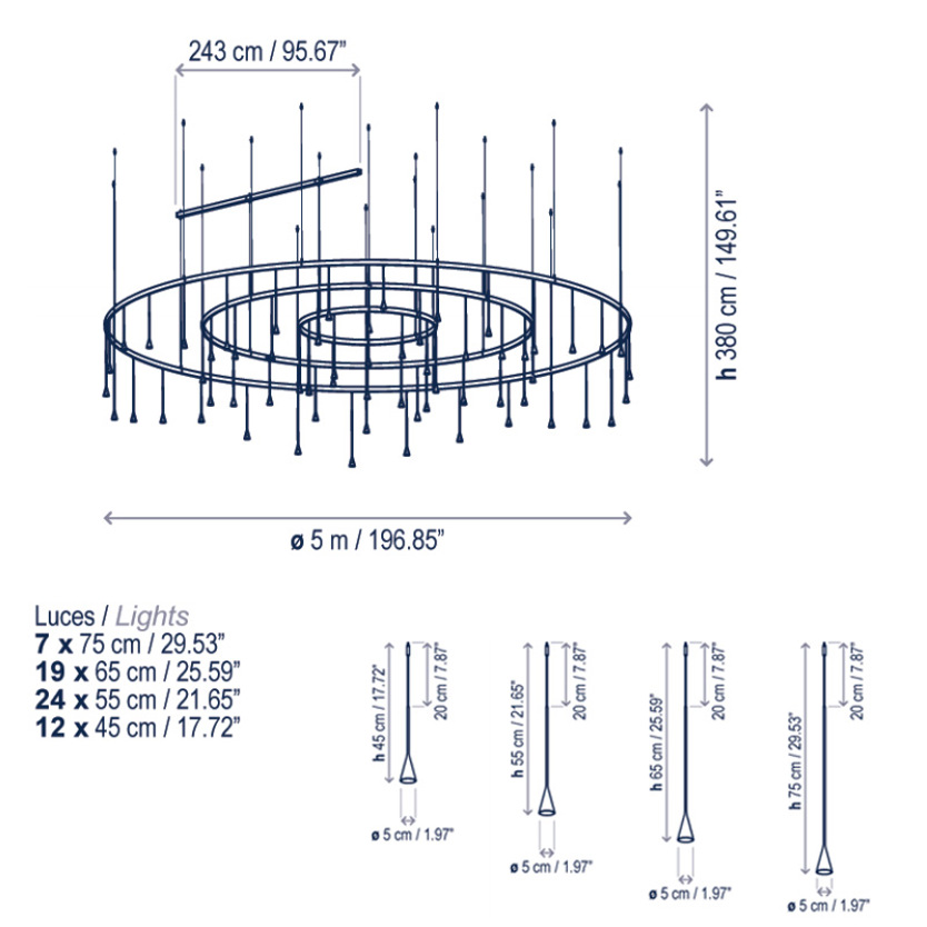 Product Code: 6B35725219056 Light source: 173.6W LED (entire piece) 30 degree angle beam each at 2700K Materials: Iron/Aluminium Dimensions: H 3800mm x 5000mm diameter. Brand: Bover Skybell is an extensive system of light structures designed to adapt to any type of application. The main characteristic being freedom due to the combined variations available. The individual pendant itself is available in 4 sizes and in an assortment of arrangements including our first catenary fixture. Made & designed in Spain by Estudi Manel Molina. **This Modular features 62 lights IP20