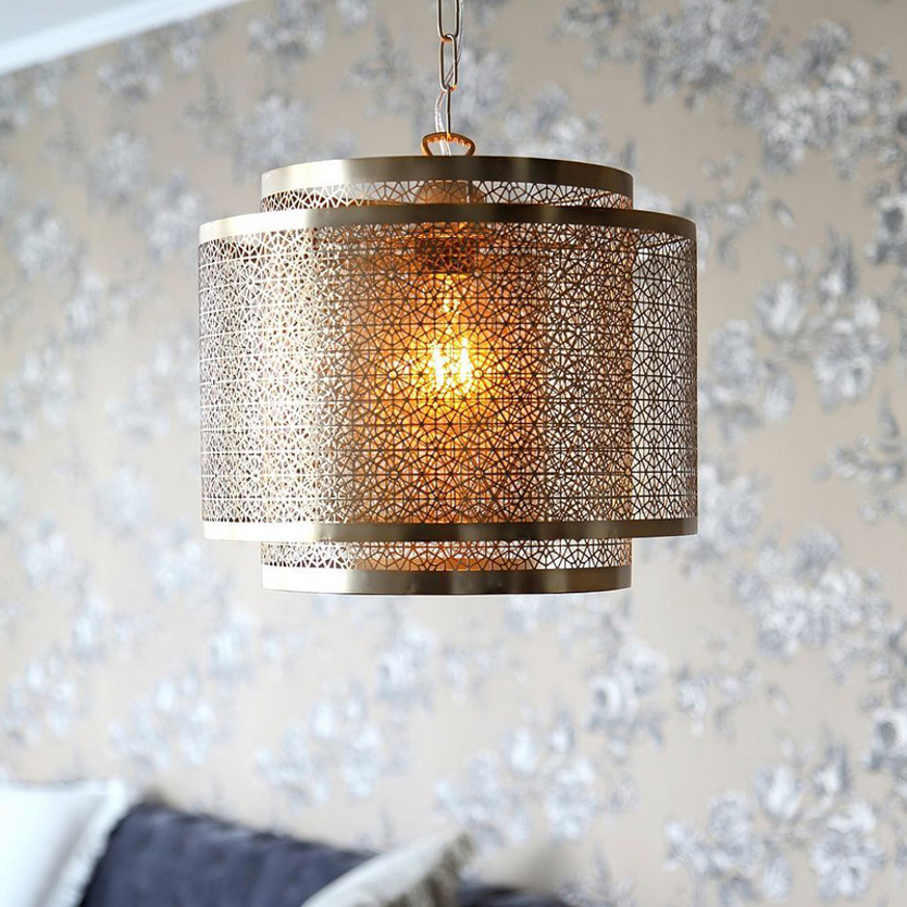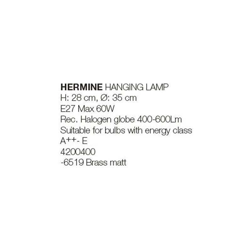 Product Code: 4B4200400-6519 Light source: 1 x 60W | E27 | Rec. 400-600lm Materials: Metal Dimensions: Ø 350mm x H 280mm The Hermine pendant uses airy layers of metal to make up a warm feeling. Available in a brass matte finish as either a pendant or wall light. Designed in Sweden