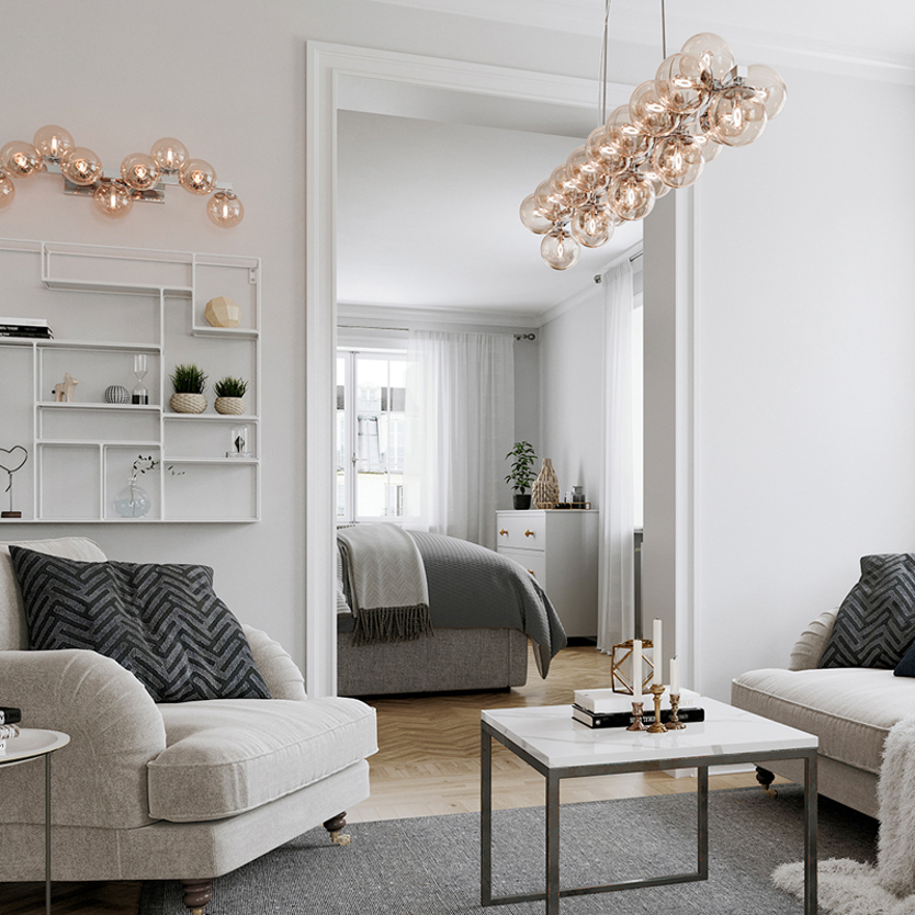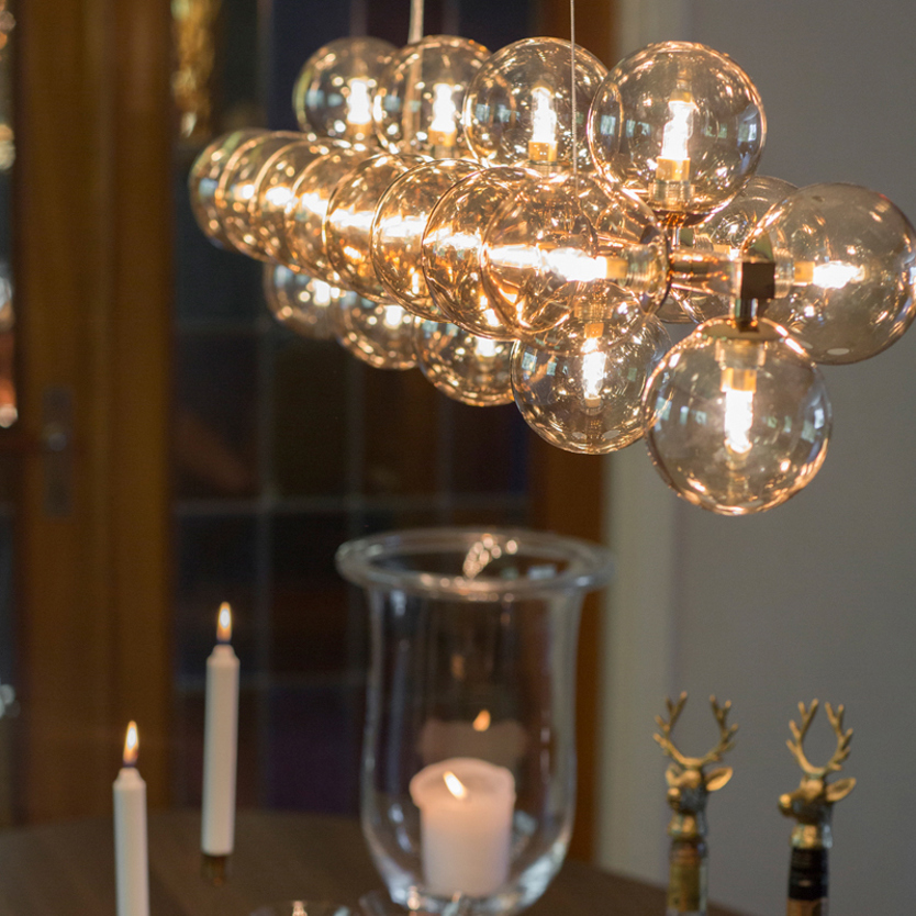 Splendor Bar is a sensational pendant light made up of 25 glass spheres surrounding a precious metal frame. Available in either Amber Glass with Gold Metal or Smoked Glass with Chrome Metal. For trade enquiries, please contact us below. RELATED ITEMS