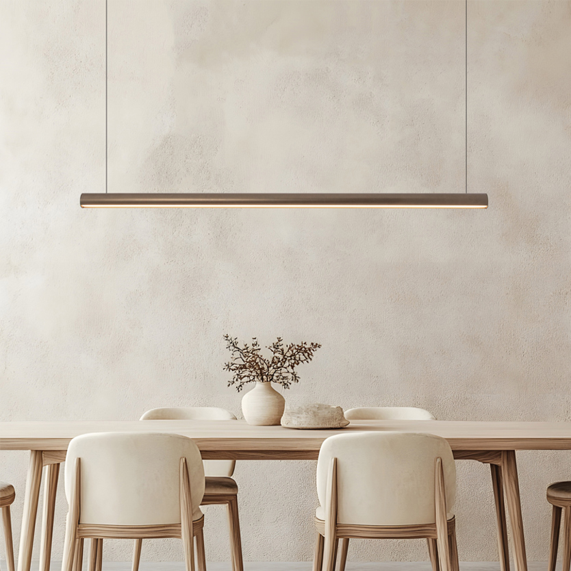 Product Code: 4Z22207 Light source: 45W LED | 3000K | 6300lm | CRI80 Materials: Aluminium, Polycarbonate Dimensions: Ø 53mm x L 1410mm | 2088mm Max Hang Height Brand: Zambelis The Calliope Pendant combines a refined linear profile with a warm bronze finish, creating a soft, elongated glow ideal for dining spaces, kitchen islands and contemporary interiors. Minimal and elegant, it offers a modern Greek-inspired accent with a timeless architectural presence. Rated IP20 suitable for indoor use. Non-Dimmable. Includes 3 year warranty. Designed by Zambelis in Greece. For trade enquiries, please contact us below. RELATED ITEMS