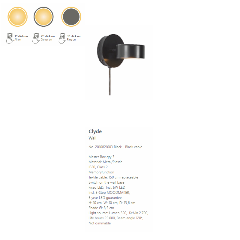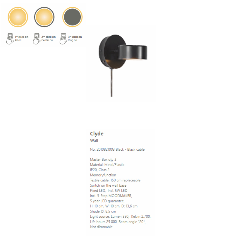 Product Code: 6N2010821003 Light source: 1 x 5W | 2700k | 350lm Materials: Metal Dimensions: Ø 85mm x D 136mm x H 100mm x W 100mm The Clyde wall light is a minimalist design finished in matte black metal. Designed in Denmark. IP20 Not Dimmable For trade enquiries, please contact us below.  |