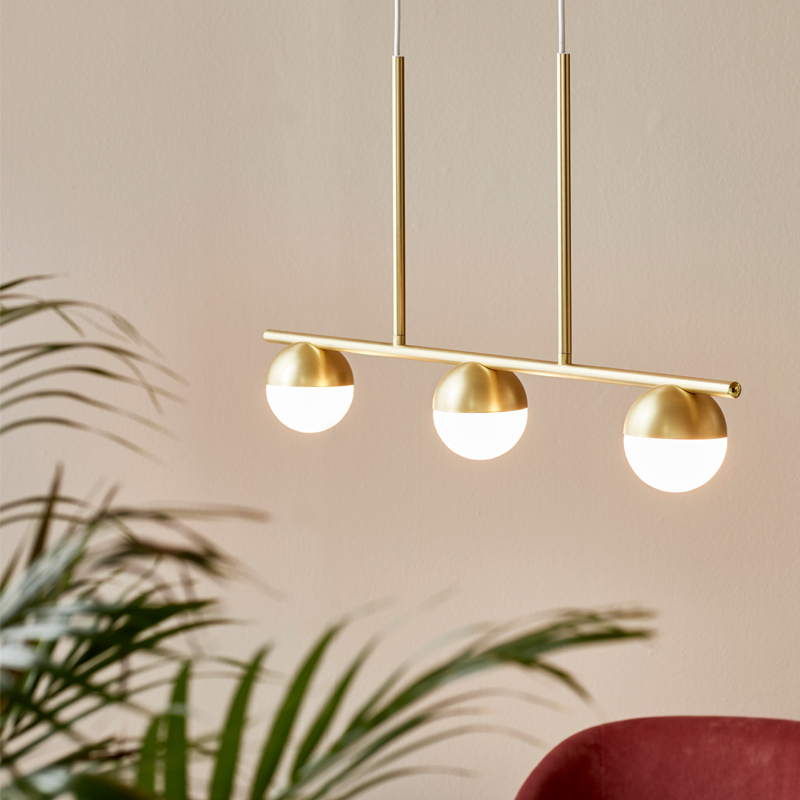 Product Code: 6N20109530xx Light source: 3 x 5W (max) | G9 Materials: Metal, Glass Dimensions: H 413mm x D 100mm x W 900mm The Contina pendant is a slim and minimalist design with opal mouthblown glass that gives a soft and glare-free light. Avaliable in a brass or black finish. Price shown for brass finish