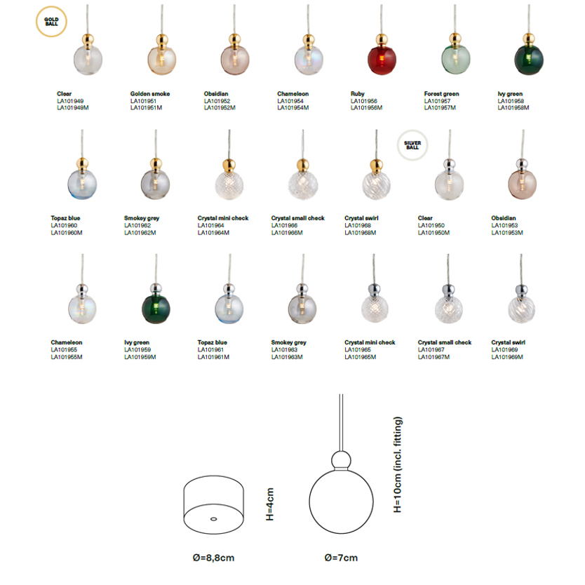 Product Code: 8ELA101951 Light source: 1 x G4 1.5W LED (max) Not Incl. Materials: Glass, Metal Dimensions: Ø 70mm x H 100mm | 2000mm clear cable Brand: Ebb & Flow Inspired by the shape of a grape, UVA shares it's name with the Italian word for the colourful fruit. As the design progressed, the simple metal ball on top revealed the expression of a perfume bottle. Available in a huge range of colours and cut-crystal (price varies). Also available in a larger size as well as version suitable for creating multi-light clusters. Price shown is for complete single pendant only. Designed in Denmark and mouth-blown in Poland. For trade enquiries, please contact us below. |