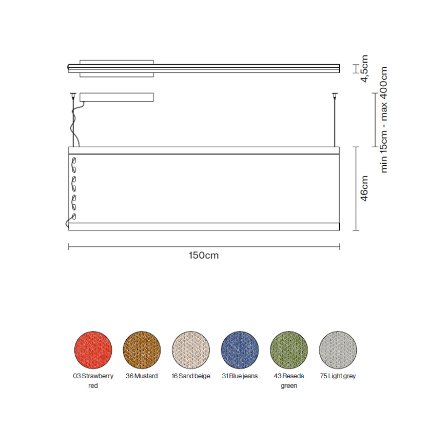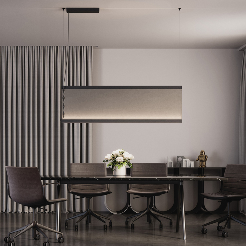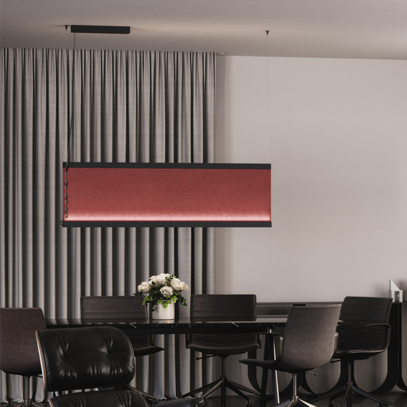 Product Code: 6FF68A51 03 Light source: 2 x 64W LED (Built-In) | 3000K | 6150lm UP 7460lm DOWN Materials: Recycled PET, Aluminium, PMMA Dimensions: H 460mm x L 1500mm x D 45mm | 4000mm cable suspension Brand: Fabbian The ETNIA system consists of a very simple linear element with direct and indirect light and interchangeable panels, suspended between a pair of Aluminium profiles. The panels are lined with sound absorbing fabrics in various colours, creating an interaction with the light, giving it dynamism and definition, between the technical and decorative world. Available in either 2700K, 3000K or 4000K and in various coloured acoustic fabrics. Also available in dimmable versions (pricing varies). Rated IP40 suitable for indoor use. Designed by MinelliFossati design studio for Fabbian and made in Italy. For trade enquiries, please contact us below. |