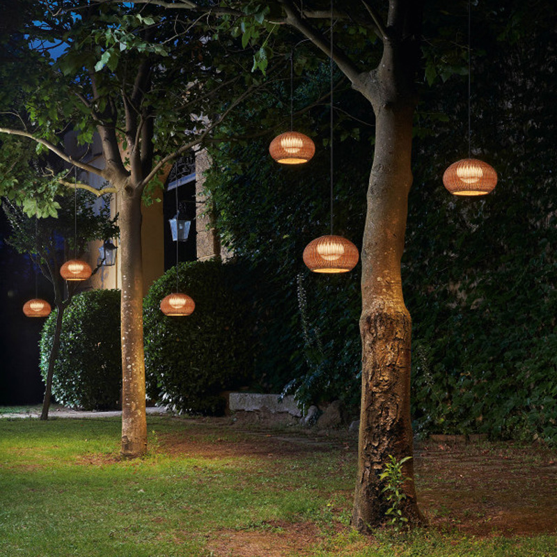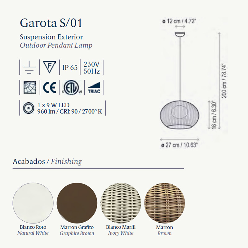 Product Code: 6B3350121403/P804 Light source: 8.4W LED (Built-In) | 2700K | 1122lm | CRI 90 | 240V Materials: Aluminum, Stainless steel, Polyethylene, Synthetic Fiber Dimensions: Ø270mm x H 160mm | 2000mm Max Hang Height Brand: Bover The Garotas are part of a diverse collection of outdoor lamps that create unique environments and contain a common concept, the shade in the form of a sea urchin. The shades are hand woven with a recyclable and non-toxic synthetic polyethylene fiber, while the light source is protected by a UV resistant polyethylene globe. Rated IP66 suitable for outdoor use. Dimmable with TRIAC. Designed by Alex Fernández Camps & Gonzalo Milà for Bover and made in Barcelona.