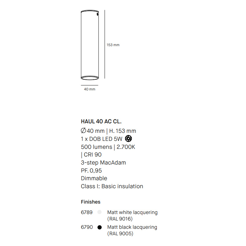 Product Code: 8M6790 Light source: 1 x 5W LED | 2700k | 500lm | CRI 90 Materials: Aluminium Dimensions: Ø 40mm x H 153mm Haul is an adaptable lighting collection for both domestic and public spaces. The simplicity and harmony of this lamp lies in the purity of an extruded steel cylinder in different sizes shining focused light. Available in white matt lacquer and black matt lacquermodels designed to combine ideally with the purity and elegance of its shape. Price varies with finishes.