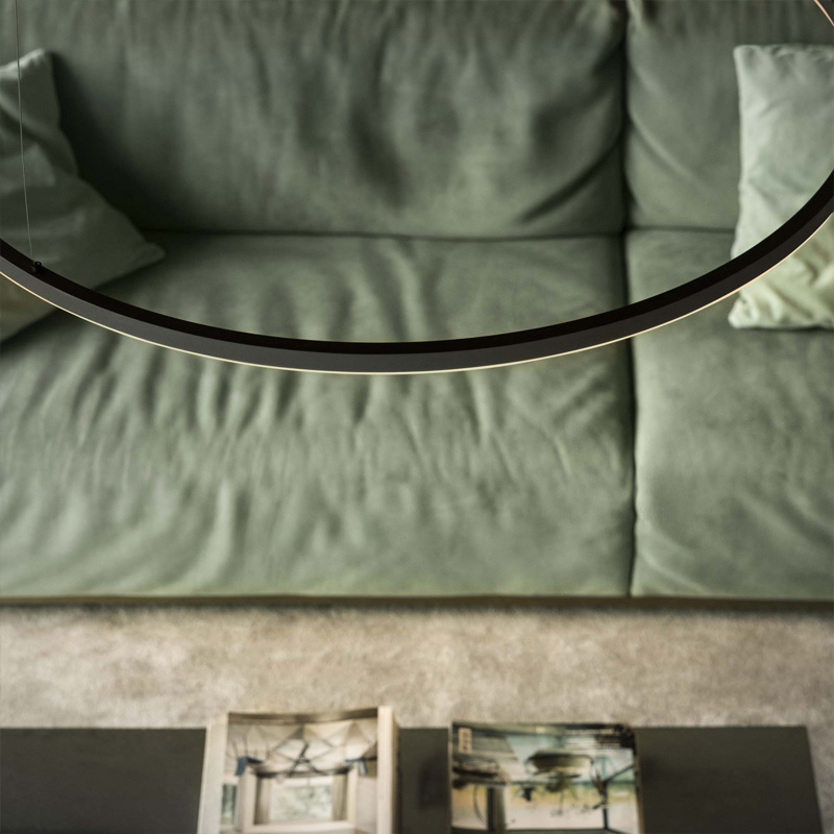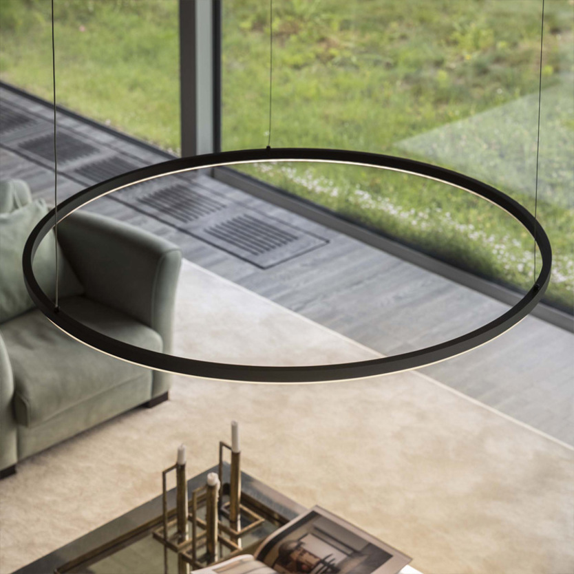 Product Code: 8I304427 Light source: 42W LED | 3000K | 4900lm | Dali Materials: Aluminium, Polycarbonate Dimensions: Ø 900mm x H 25mm | 2025mm Max Hang Height Brand: Ideal Lux The Oracle collection features a minimalist ring design that brings sophistication to any setting. Perfect for dining areas, meeting rooms, or open spaces, it casts a smooth, even light, creating an inviting ambiance. The Oracle Slim’s slim profile complements contemporary interiors without overpowering the space, offering both style and functionality. Available in Black or White, including other model variants (pricing varies). Rated IP20 suitable for indoor use. Dimmable with DALI / Push dimming. Includes a 5-year LED warranty. Designed by Ideal Lux in Italy. For trade enquiries, please contact us below. RELATED ITEMS