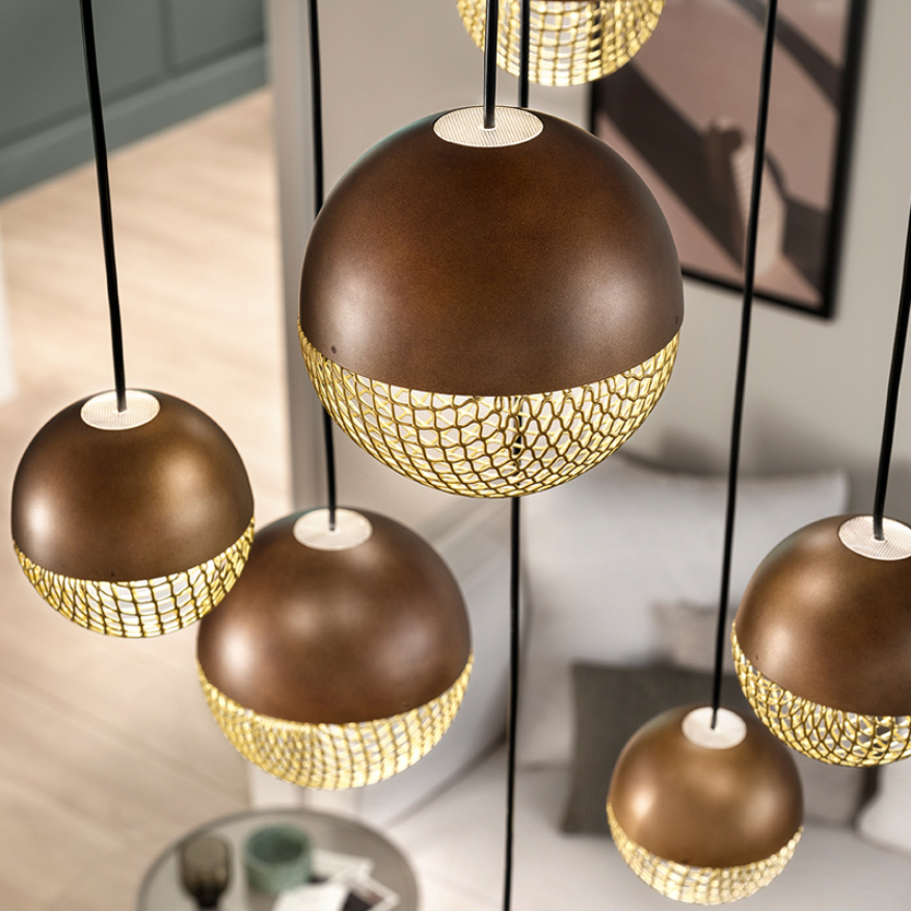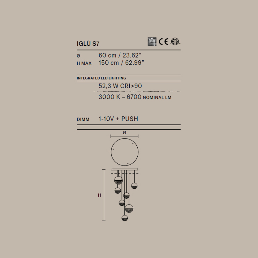 Product Code: 2MIGLU S7 Light source: LED 52.3W (Integrated) | 3000K | CRI 90 | 6700lm Materials: Metal Dimensions: Ø 600mm | 1500mm Suspension Cable Brand: Masiero Iglu is an intuition born from observing the perfection of the sphere, transformed into a perfect, recognisable and unique shape by woven mesh that creates a pattern of light and shadow, transforming the metal into a luminous jewel. The collection is comprised of a series of pendants, ceiling and wall lights available in various configurations, all featuring a Bronze Patina finish with woven Gold mesh. Dimmable 1-10V + PUSH. Designed by Oriano Favaretto and made in Italy. For trade enquiries, please contact us below. |
