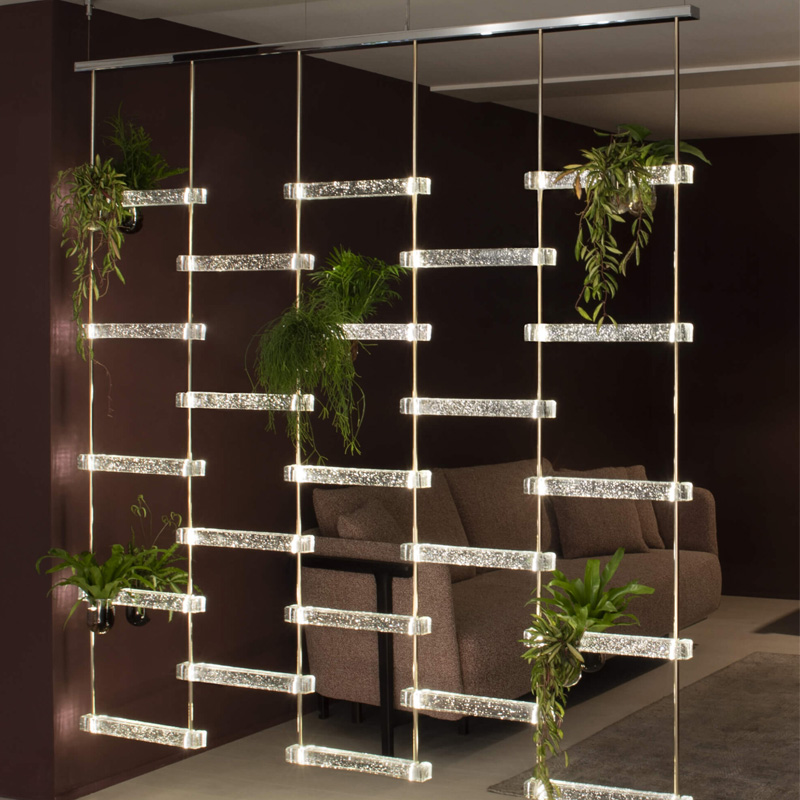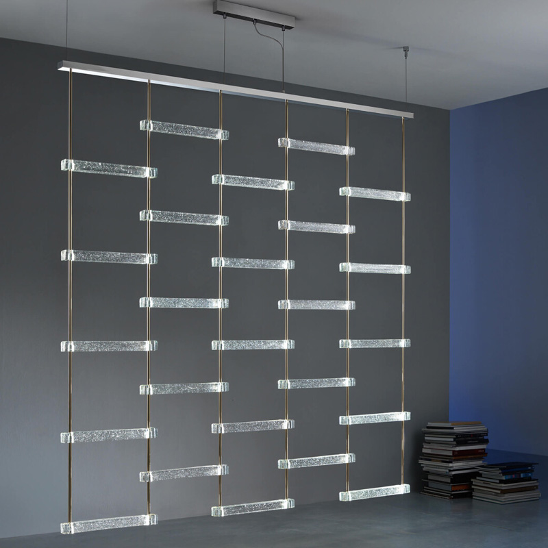 Product Code: 6I00687200001 Light source: 14W LED (Built-In) | 3000K | 1700lm Materials: Metal, Glass Dimensions: H 2150mm x W 2000mm x D 50mm | 1000mm Cable Suspension Brand: Italamp With Piola, light becomes a structural and architectural element. The designer started from the concept of a luminous wall, creating a modular grid composed of braided tubes with cast glass bars, enriched with a texture of micro-bubbles. Available with Light Gold or Chrome metal detail. Also available in 2700K colour temperature. This product is modular and available in a variety of standard or custom configurations (pricing varies). Dimmable on request (pricing varies). Rated IP20 suitable for indoor use. Designed by Danilo De Rossi for ITALAMP and made in Italy. For trade enquiries, please contact us below. |