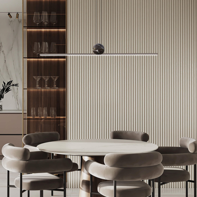 Product Code: 6I081460S0001 Light source: 24W LED (Built-In) | 3000K | 2000lm Materials: Metal, Marble Dimensions: L 1200mm x H 120mm x D 120mm | 1000mm Suspension Cable Brand: Italamp Translating literally to "Ruler", the combination of marble and fine metal command a sense of presence and structure while majestically floating. This linear pendant light features minimal support cables giving the appearance of lightness, contrasted by the marble centre piece and stringent Aluminium frame. Available in a Matt Champagne or Matt Black finish with the decorative sphere in Gold Calacatta marble. Designed by Stefano Traverso and made in Italy. Rated IP20 suitable for indoor use. For trade enquiries, please contact us below. |