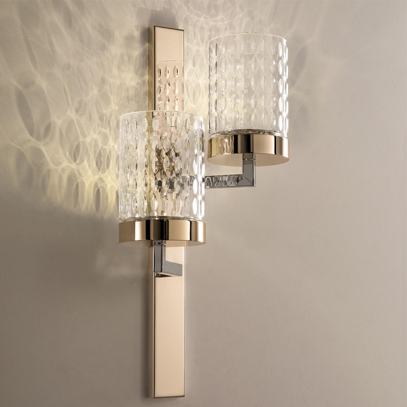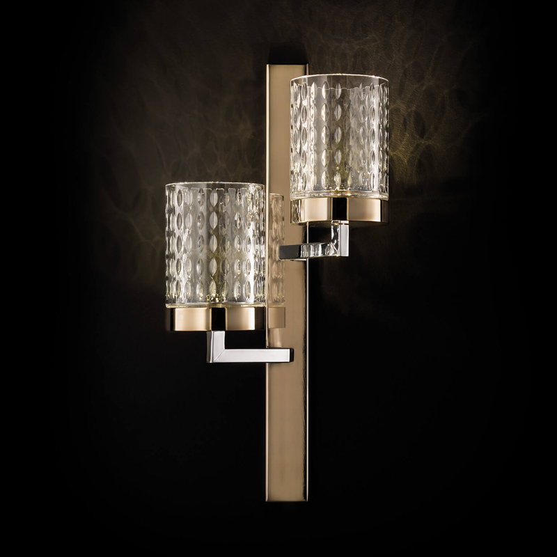 Product Code: 6I00725AP2001 Light source: 1 x 13W | 3000k | 1200lm | 230V Materials: Metal, Glass Dimensions: H 600mm x W 290mm x D 190mm The Quarzo wall light features a metal with light gold and chrome finish along with a beautiful carved crystal glass diffusers. Available in different sizes IP20 Designed by Studio Mamo & made in Italy