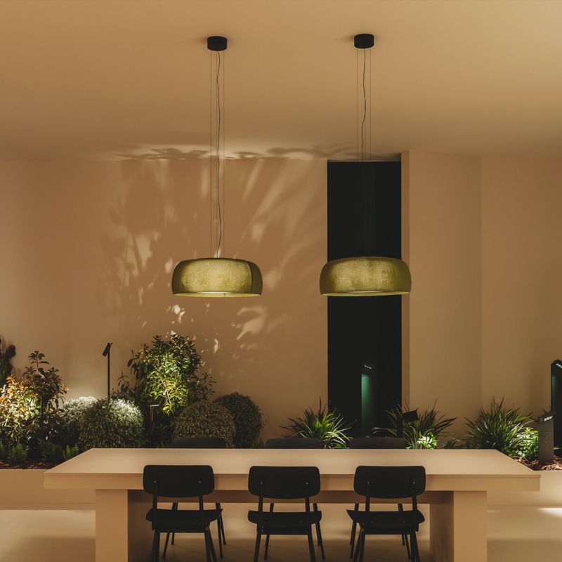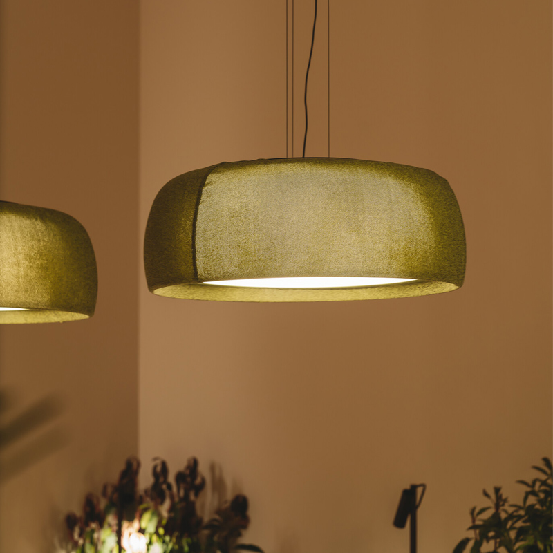 Product Code: 1L00-8933-U1-J4 Light source: 24.3W LED (Built-In) | 3000K 1274lm |CRI90 Materials: Steel, Textile, Methacrylate Dimensions: Ø 612mm | Max Hang Height 4000mm Brand: LedsC4 Gong is a striking luminaire that provides a filtered light, which seeps suggestively through the fabric of its shade. Gong is intended to offer a high light output in a decorative body, available with three standard finishes and custom fabric options available upon request, Gong catches the eye with its distinctive design, whether switched on or off. Dimmable with Phase-Cut, other options on request. Also available in other colour temperatures. Rated IP20 suitable for indoor use. Designed by Francesc Vilaró for LedsC4 in Spain. For trade enquiries, please contact us below. |