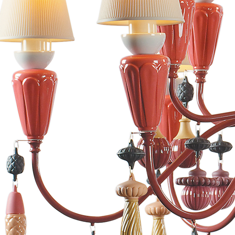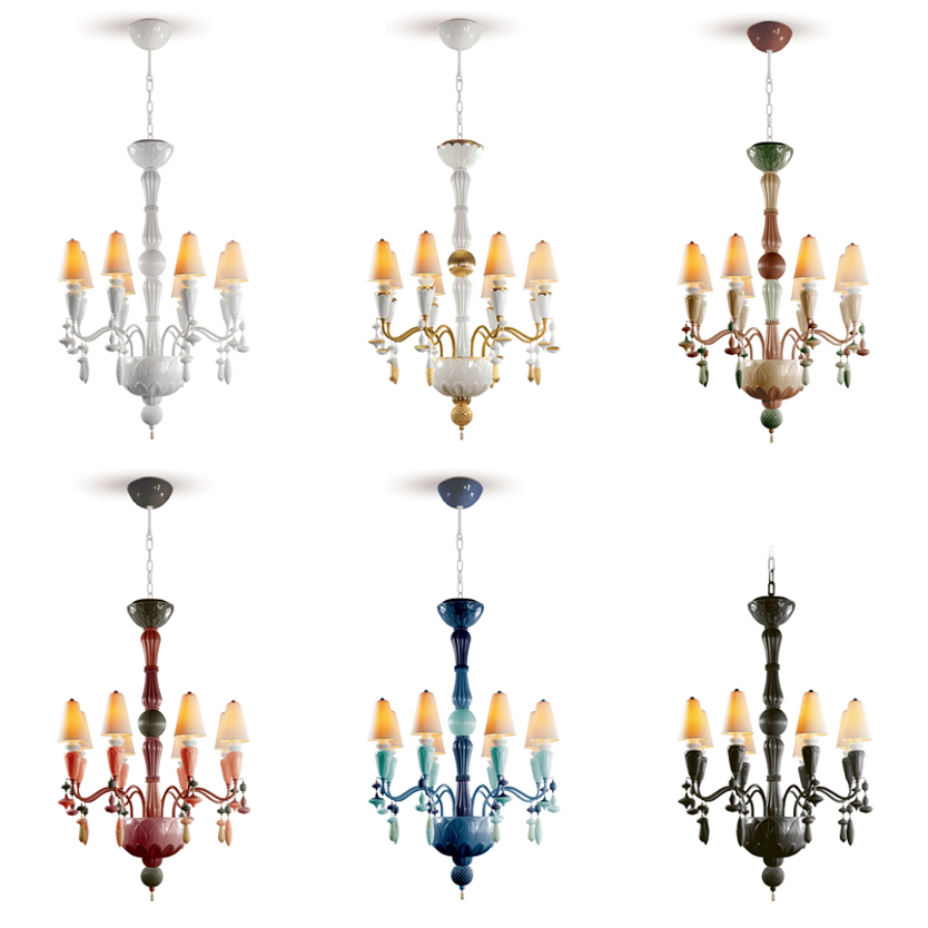 Product Code: 8L01023808 Light source: 8 x E14 9W LED (Max) | Not Incl. Materials: Porcelain, Metal Dimensions: Ø 700mm x H 1050mm | 2730mm Max Hang Height Brand: Lladro Filtered through the optic of Art Deco, the Ivy & Seed collection's geometric forms have a soft, rounded finish that counteracts its cut glass edges. This collection draws inspiration from seeds, fresh water and warm light resulting in pieces adorned with bulbs, leaves, seeds and petals. Available in various colours and patterned porcelain matt-white shades (pricing may vary). Rated IP20 suitable for indoor use. Dimmable with dimmable globes. Designed by Dept. Diseño y Decoración for Lladro and made in Spain. Please note that porcelain products are handmade and the exact size, colour and texture of each piece may vary. For trade enquiries, please contact us below. |