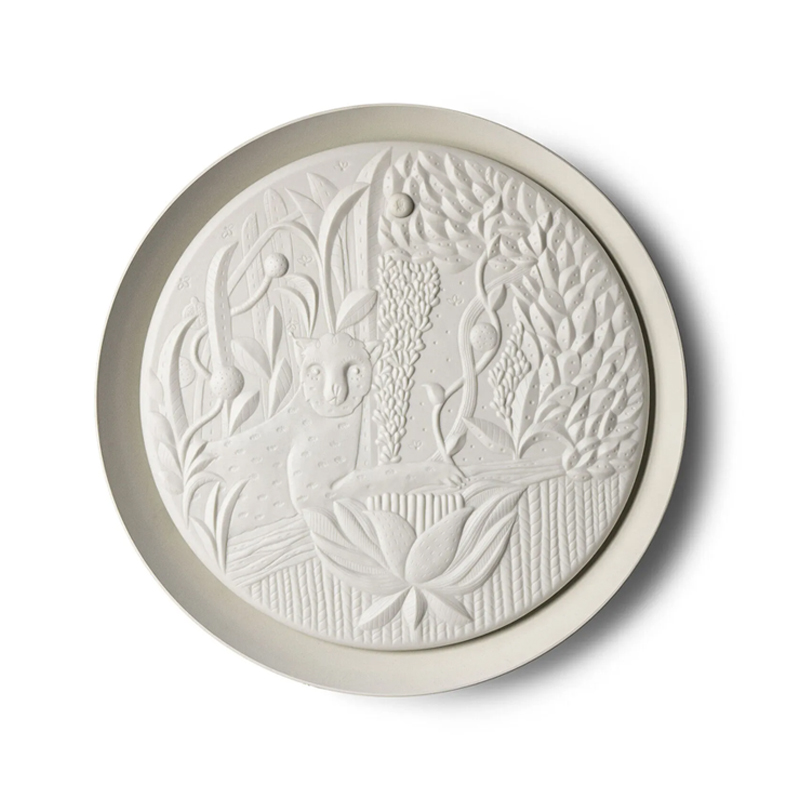 Product Code: 8L01024149 Light source: 2 x E14 9W LED (Max) | Not Incl. Materials: Porcelain Dimensions: Ø 400mm x D 90mm Brand: Lladro The design for the Jungle Wall light features a porcelain relief inspired by wildlife; a feline and a variety of tropical plants, minutely etched by hand. Made in translucent matt-white porcelain, the Jungle wall lamp looks stunning on or off and showcases the fine detail and mastery of the porcelain work. Rated IP20 suitable for indoor use. Dimmable with dimmable globes. Designed by Aleksandra Zeromska & Susana Rodriguez for Lladró and made in Spain. Please note that porcelain products are handmade and the exact size, colour and texture of each piece may vary. For trade enquiries, please contact us below. |