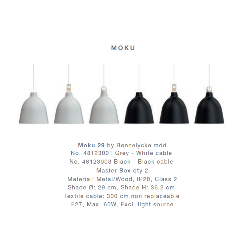 Product Code: 6N4812300x Light source: 60W (max) E27 Materials: Metal/Wood Dimensions: H 362mm. 290mm diameter. Cord length 3000mm Brand: Nordlux The latest release from Nordlux sees their signature Scandinavian style meet contemporary minimal design in a classic way. The Moku reflects Japanese influence and combines a classic shape with traditional design principles. Available in grey & black and additional optional wooden tops. Designed in Denmark. Globe not included. IP20