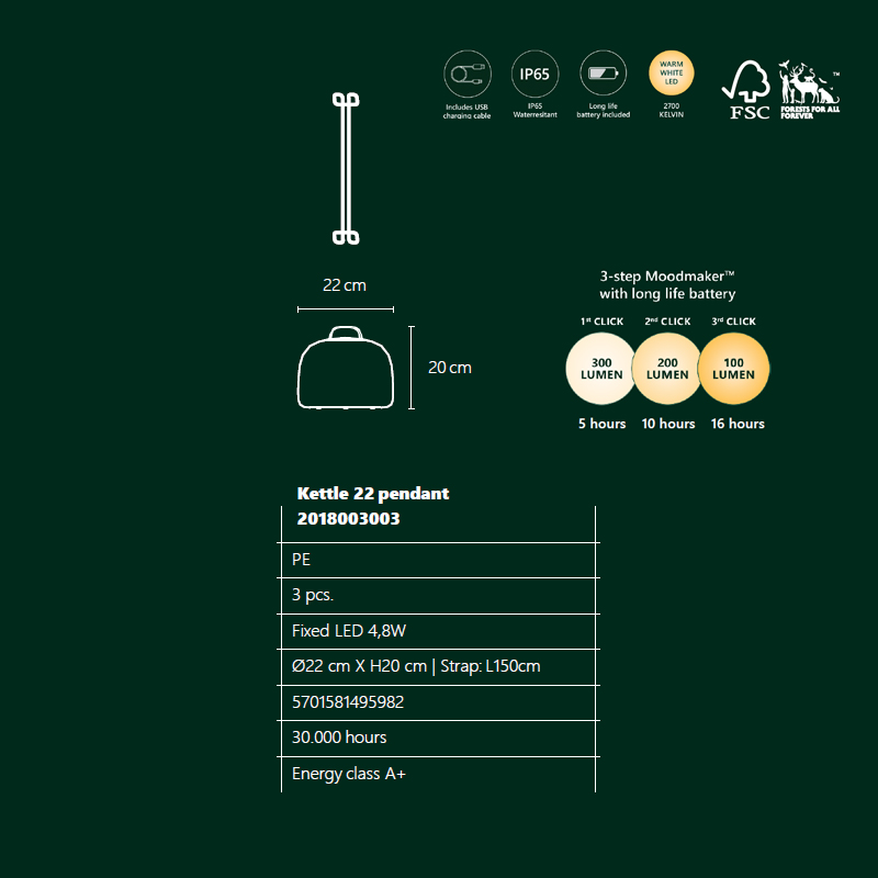 Product Code: 6N2018003003 Light source: 1 x 4.8W | 2700k | 300lm | 5V Materials: Plastic Dimensions: Ø 220mm x H 196mm BRAND: Nordlux Design and functionality are carefully thought through, so the series beautifully illuminates your everyday life - both inside and outside. Kettle is not only decorative, it also provides a good light, and simultaneously the brightness of the light can be adjusted in three levels. The built-in battery has a durability up to five hours at full power and even longer if the light is turned down to a cozy lighting. The battery is easily charged via the included USB cable. Kettle 22 is a beautiful lamp which can be placed exactly where you want. Hang it in the tree in the garden with the included cord or place it directly on the terrace or floor in the living room. Kettle is produced in hard plastic and is durable against wind and water. IP65 Designed in Denmark Dimmable