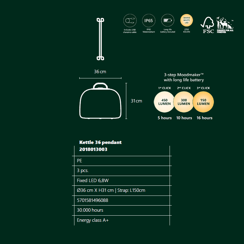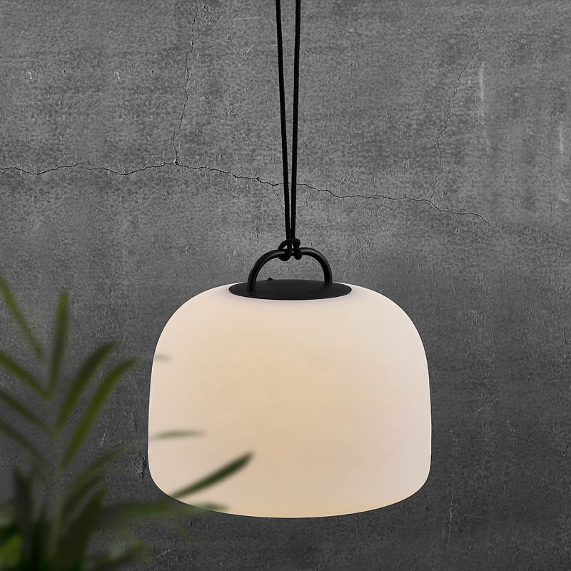BRAND: Nordlux Design and functionality are carefully thought through, so the series beautifully illuminates your everyday life - both inside and outside. Kettle is not only decorative, it also provides a good light, and simultaneously the brightness of the light can be adjusted in three levels. The built-in battery has a durability up to five hours at full power and even longer if the light is turned down to a cozy lighting. The battery is easily charged via the included USB cable. Kettle 36 is a beautiful lamp which can be placed exactly where you want. Hang it in the tree in the garden with the included cord or place it directly on the terrace or floor in the living room. Kettle is produced in hard plastic and is durable against wind and water. IP65 Designed in Denmark Dimmable