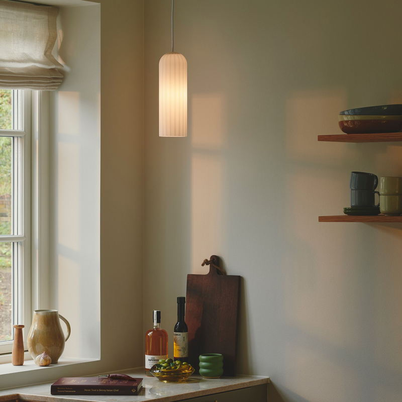 Product Code: 6N2412523001 Light source: 1 x E27 25W (Max) | not Incl. Materials: Glass, Plastic Dimensions: Ø 100mm x H 300mm | 2000mm Cable Suspension Brand: Nordlux Miella has a simple yet elegant design expression. With its beautiful fluted glass, this pendant embodies modern glamour and elegance in one streamlined design. Hang several pendants together in a cluster or in a row to create your own personal style. Rated IP20 suitable for indoor use. Dimmable with dimmable globe. Designed by Nordlux Denmark.