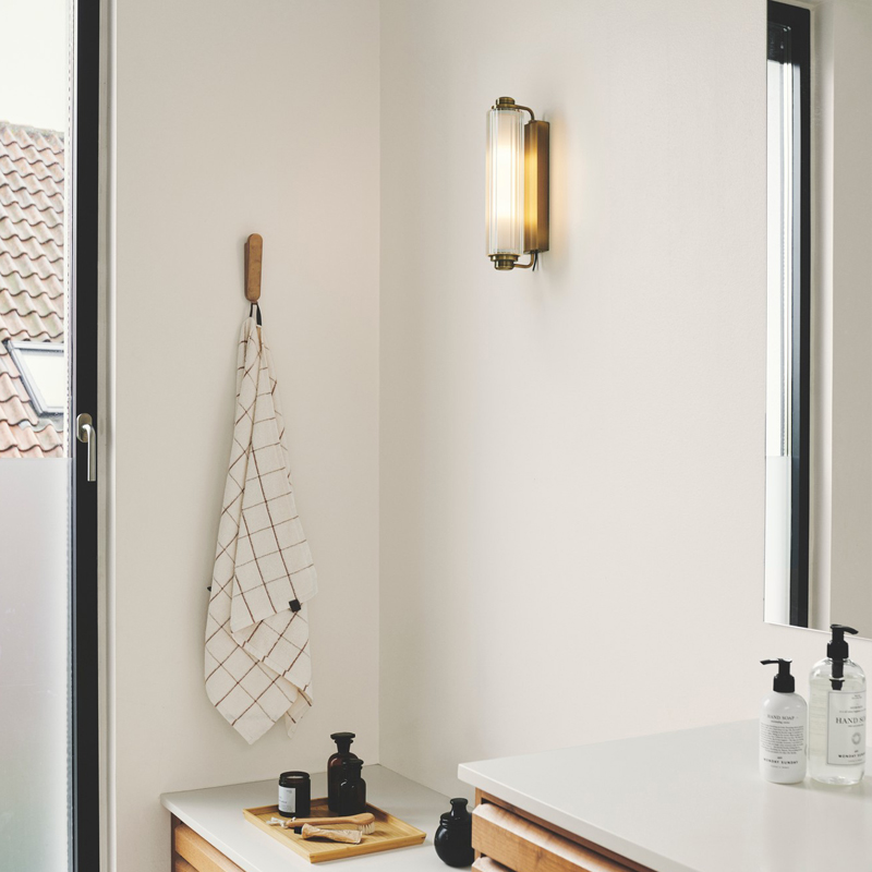 Product Code: 6N2310521035 Light source: 2 x E14 25W (Max) | Not Incl. Materials: Plastic, Metal Dimensions: H 350mm x W 78mm x D 125mm | Base H 265mm Brand: Nordlux The Nimal series is produced in a round and elegant Art Deco design with a beautiful ribbed shade. The opal white diffuser ensures a pleasant light. This wall lamp creates the perfect ambience above or beside your bathroom mirror. Available in Brass or Black (price varies). Rated IP44 suitable for bathrooms and outdoor use. Dimmable with dimmable globes. Designed by Nordlux Denmark.