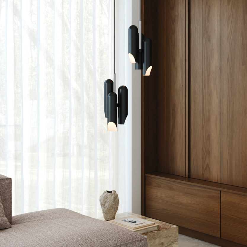 Product Code: 6N2320283003 Light source: 3 x GU10 8W LED (max) | Not Incl. Materials: Metal, Plastic Dimensions: Ø 207mm x H 440mm | 3000mm Fabric Cable Suspension Brand: Nordlux The Rochelle series by Danish designer Charlotte Høncke has a modern Italian design language with three slender, sculptural lamp heads. Cool and almost masculine chrome details add a beautiful contrast to the matte black surface. Dimmable with compatible globes. Rated IP20 suitable for indoor use. Designed by Charlotte Høncke for Nordlux Denmark. For trade enquiries, please contact us below. RELATED ITEMS