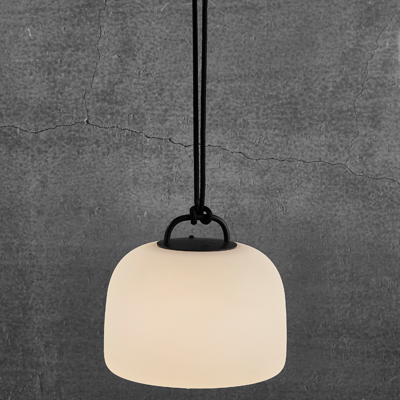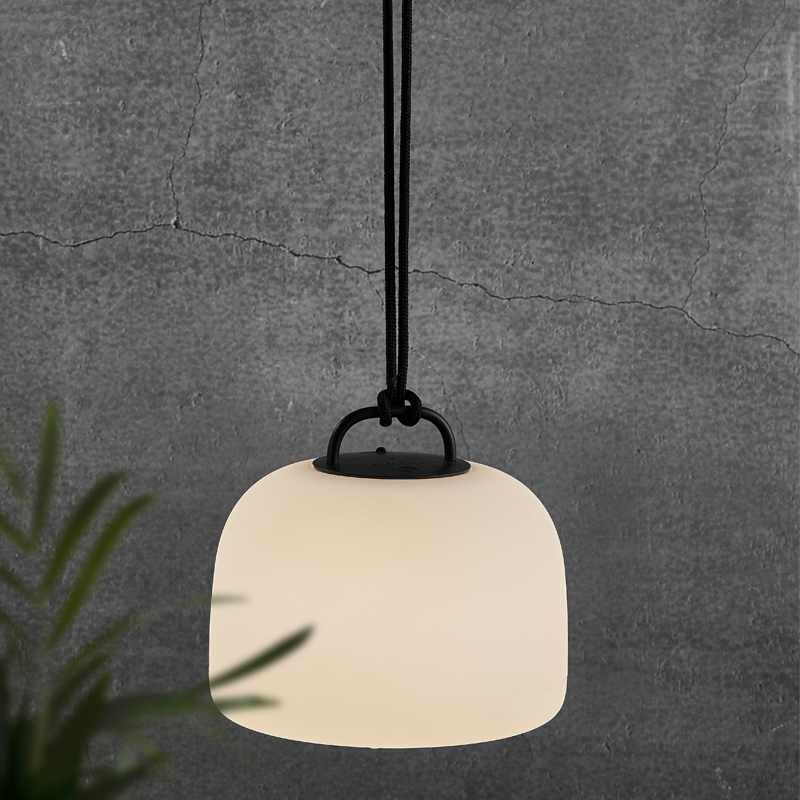Product Code: 6N2018003003 Light source: 1 x 4.8W | 2700k | 300lm | 5V Materials: Plastic Dimensions: Ø 220mm x H 196mm BRAND: Nordlux Design and functionality are carefully thought through, so the series beautifully illuminates your everyday life - both inside and outside. Kettle is not only decorative, it also provides a good light, and simultaneously the brightness of the light can be adjusted in three levels. The built-in battery has a durability up to five hours at full power and even longer if the light is turned down to a cozy lighting. The battery is easily charged via the included USB cable. Kettle 22 is a beautiful lamp which can be placed exactly where you want. Hang it in the tree in the garden with the included cord or place it directly on the terrace or floor in the living room. Kettle is produced in hard plastic and is durable against wind and water. IP65 Designed in Denmark Dimmable