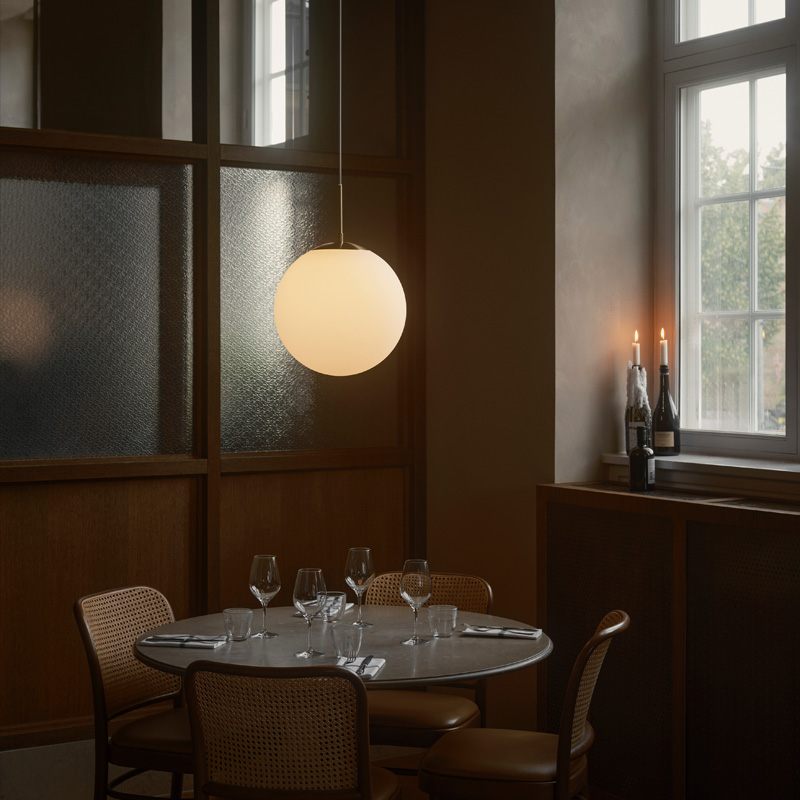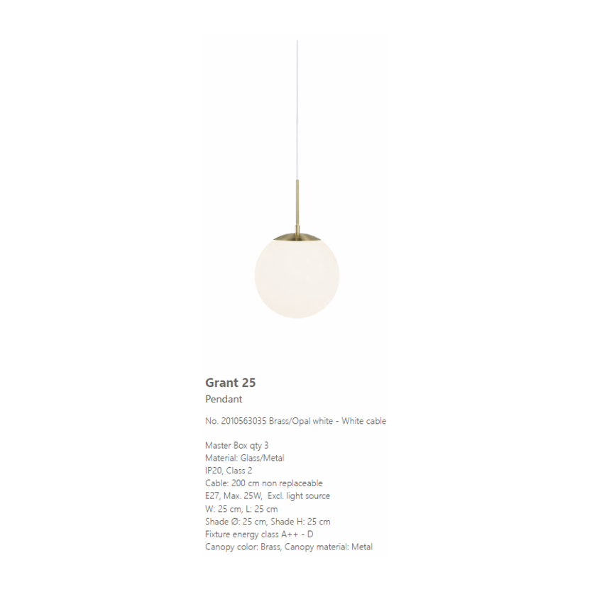 Product Code: 6N2010563035 Light source: 1 x E27 25W (Max) | Not Incl. Materials: Metal, Glass Dimensions: Ø 250mm x H 250mm | 2000mm Suspension Cable Brand: Nordlux The Grant series pairs opal-white mouth-blown glass with a sleek brass frame, balancing simplicity and elegance in a timeless design. Each handcrafted glass dome is unique, adding a decorative touch and warm glow to any space. Available in 3 different sizes (price varies). Rated IP20 suitable for indoor use. Dimmable with dimmable globe. Designed by Nordlux Denmark. For trade enquiries, please contact us below. RELATED ITEMS