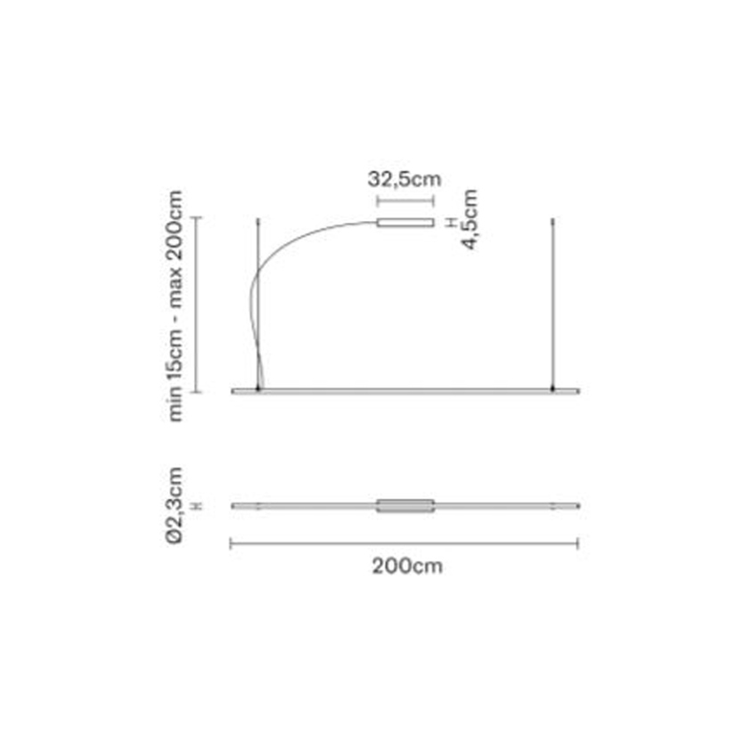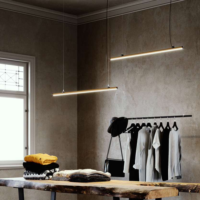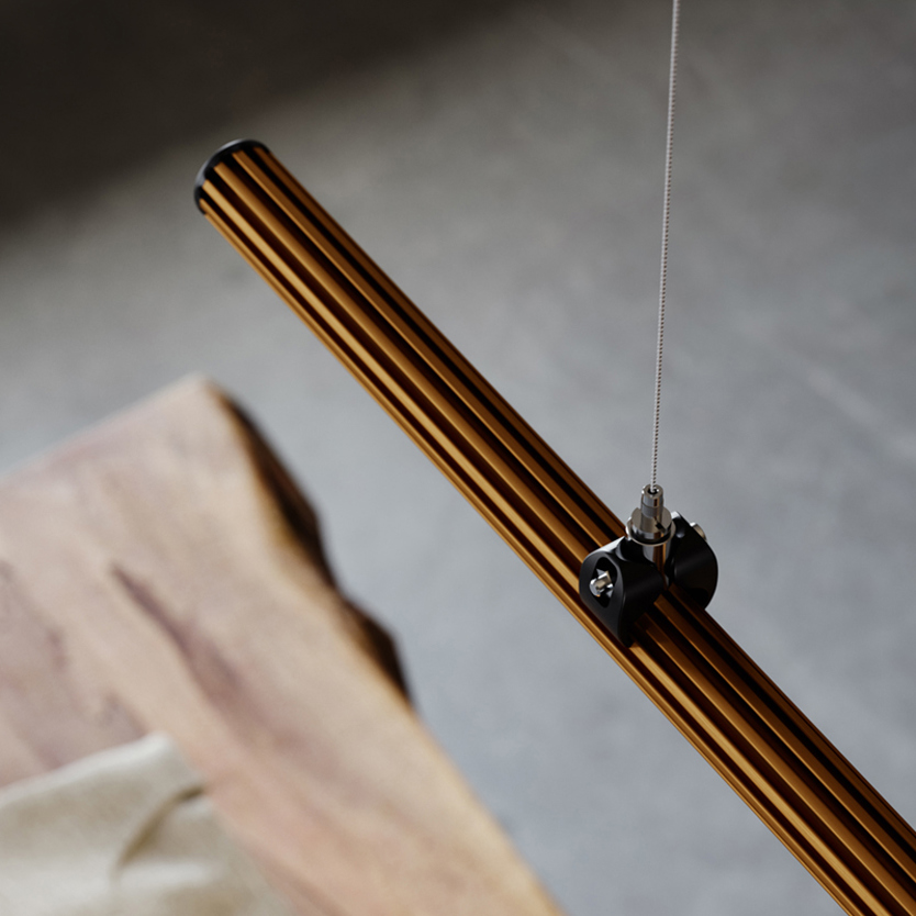 Product Code: 6FF44A03 76 Light source: 1 x 28.8W | 3000k | CRI 90+ | 240V Materials: Aluminium Dimensions: W 200mm x H 23mm These pendant lamps, made of black anodised aluminium and bronze bars, are available in three sizes. The suspension bars can be oriented for downward or upward illumination. IP20 Dimmable For trade enquiries, please contact us below. |