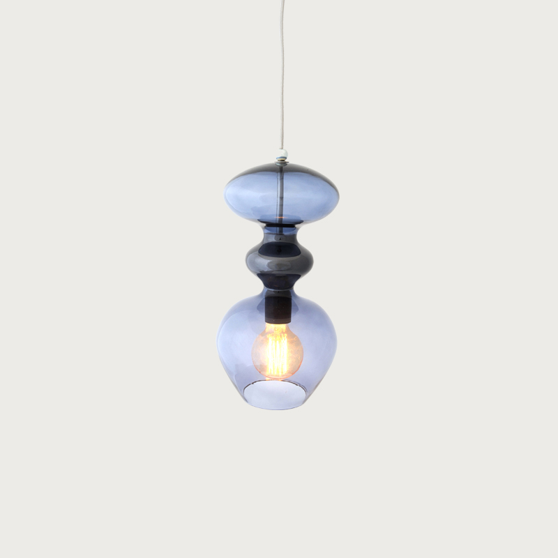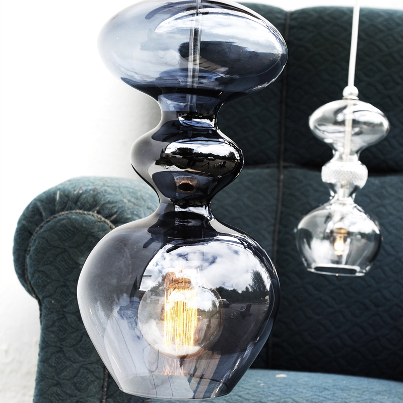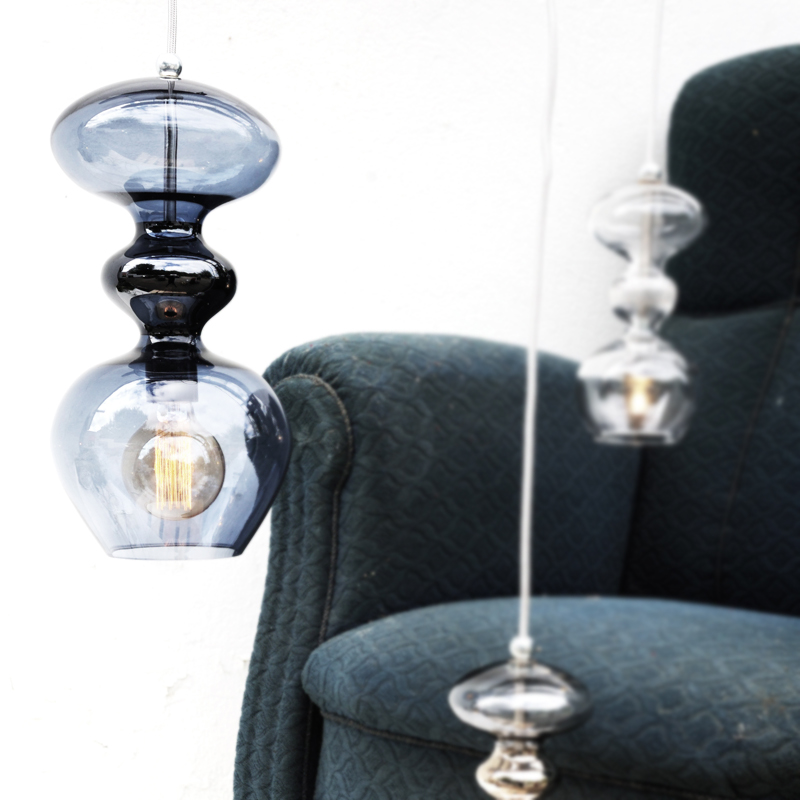 A blend of mouth-blown glass and metal finishes in a variety of colours.