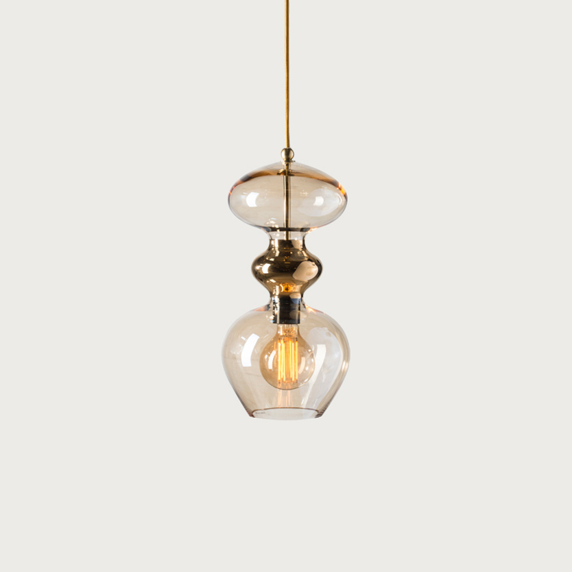 A blend of mouth-blown glass and metal finishes in a variety of colours.