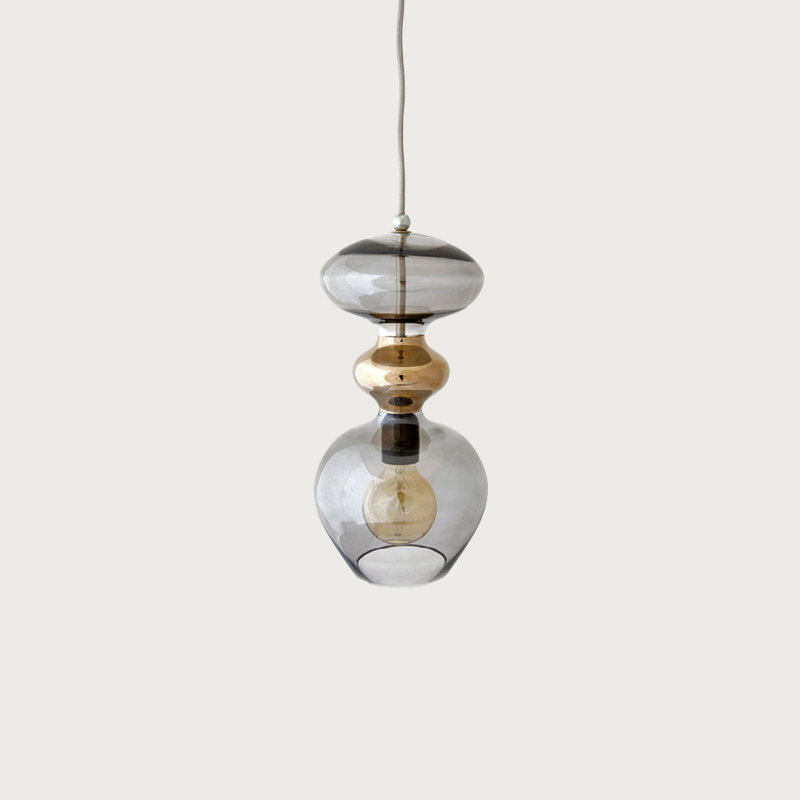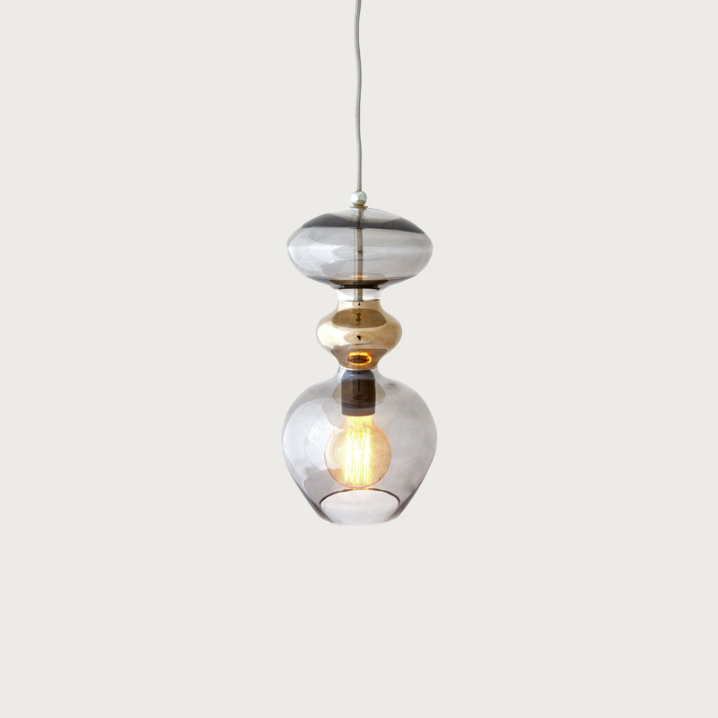 A blend of mouth-blown glass and metal finishes in a variety of colours.