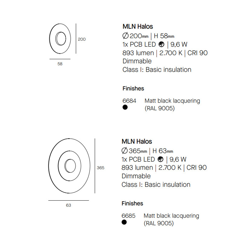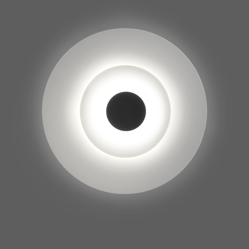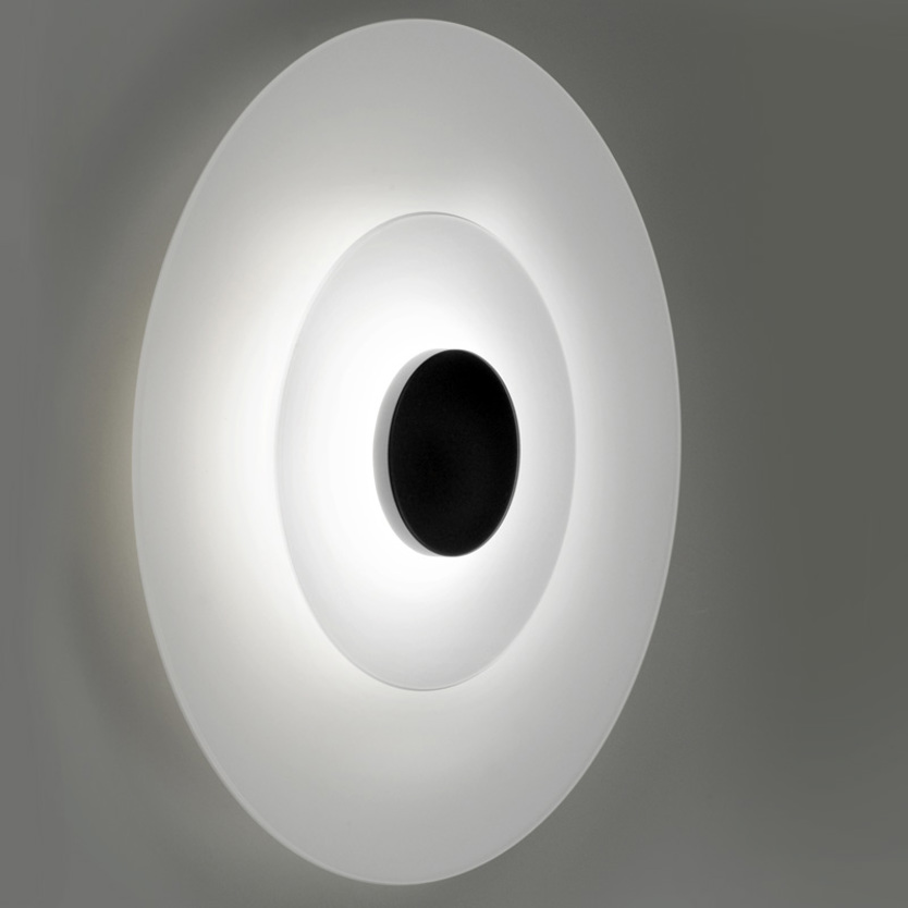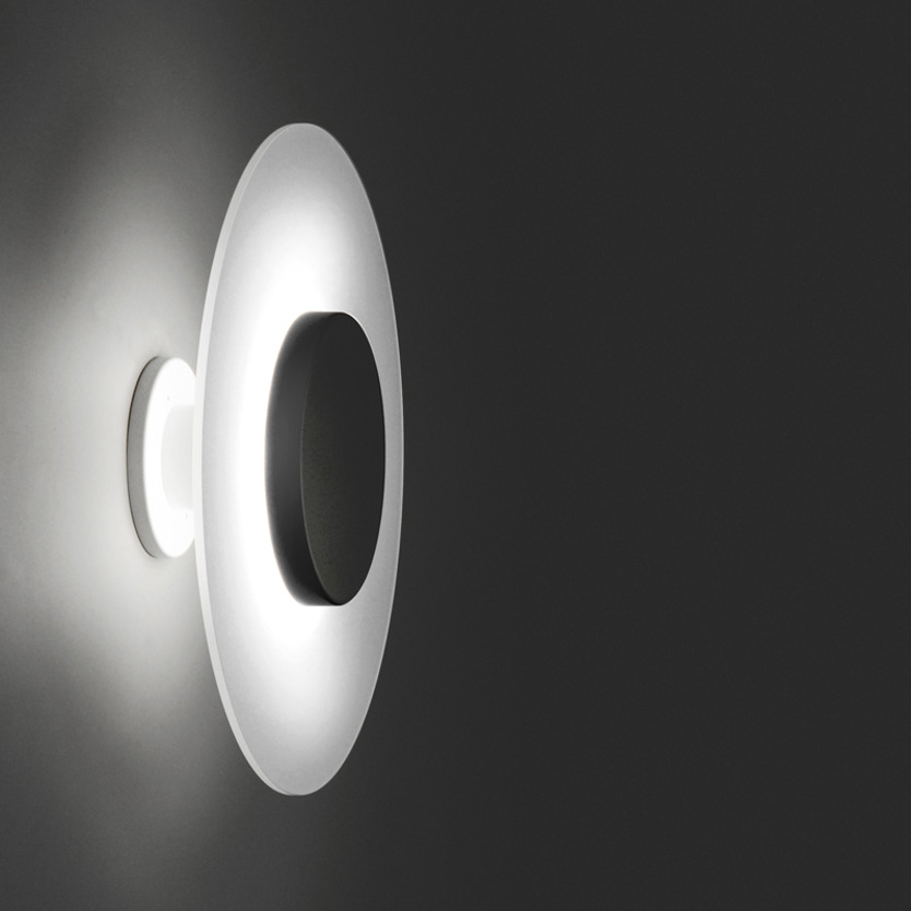 Halos pure geometric shapes enable it adapt to any space and endow it with a timeless quality. The subtlety with which it reflects light on the acid-etched satin glass shades ensures a soft glow and a gentle presence in the space. The halos of light generated in circles concentrically to the lacquered steel head are what give it its name. The series comes in two wall versions of different sizes.