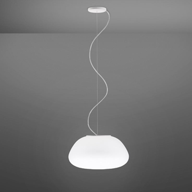 The Lumi Poga pendant lamp has a diffuser in white blown glass with circular and flattened shape. This pendant is well suited to the kitchen or living room of the home or to the public areas of bars and restaurants.