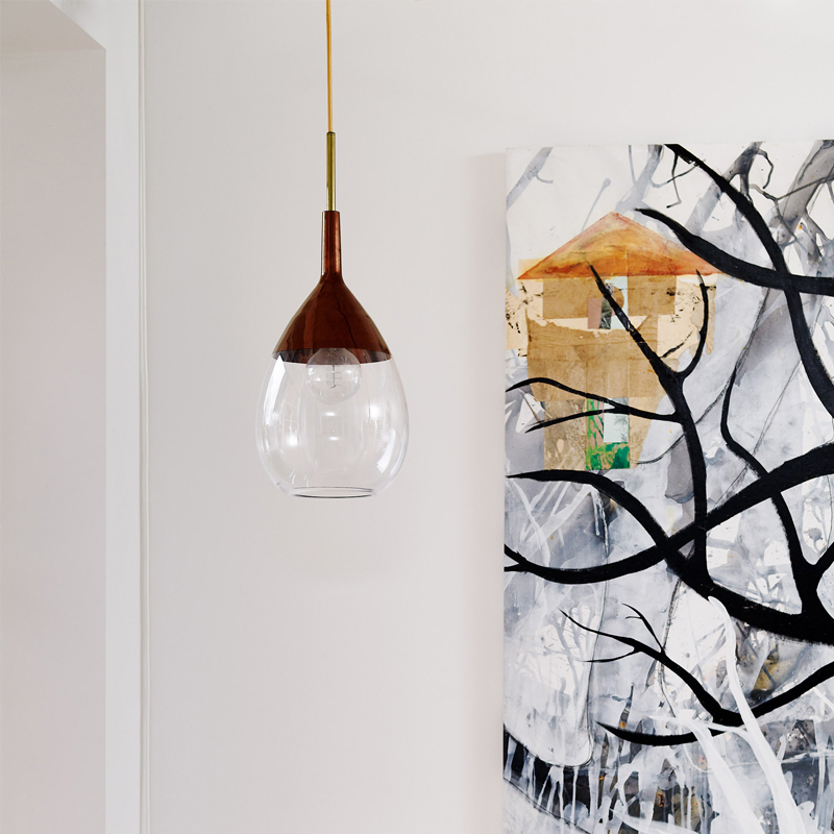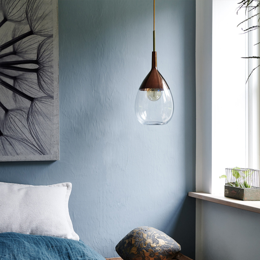A blend of mouth-blown glass and metal finishes in a variety of colours.