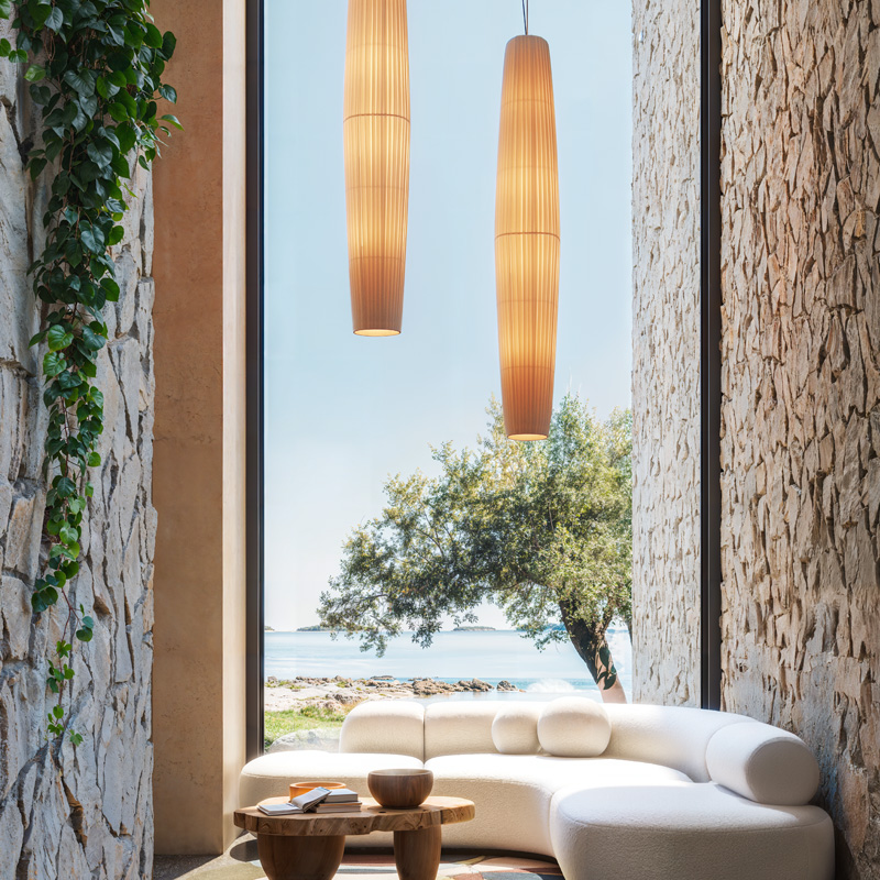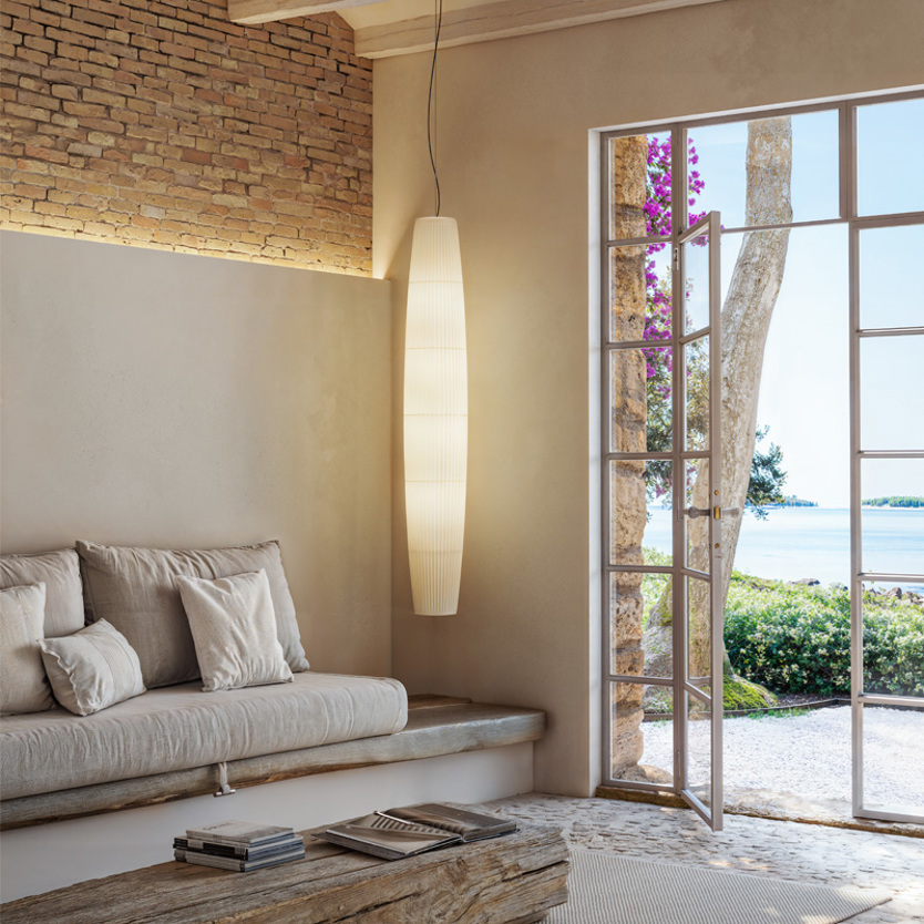 Product Code: 6B4419556TOP/P509TN Light source: 4x 15W LED (Max) | Not Incl. Materials: Iron, Brass, Ribbon Dimensions: Ø 300mm x H 1900mm | 3120mm Max Hang Height Brands: Bover A sculptural statement inspired by soft Mediterranean forms, the Maxi Pendant exudes warmth and fluidity. Crafted in Spain with a distinctive vertical silhouette, it’s wrapped in handwoven ribbon available in elegant Cream or White for a textured, diffused glow, with the canopy and suspension cable in black. Perfect for framing an entrance, anchoring a void, or adding softness to a minimalist setting. Rated IP20 suitable for indoor use. Dimmable with dimmable globes. Designed by Joana Bover and made in Barcelona. For trade enquiries, please contact us below. RELATED ITEMS