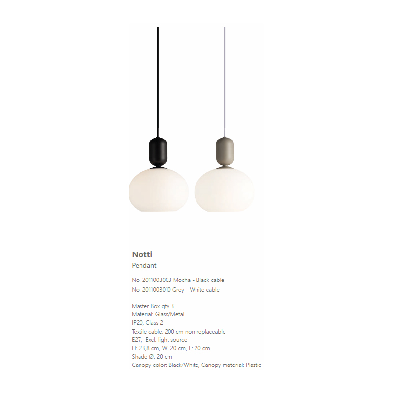 Product Code: 6N20110030xx Light source: 1 x E27 Materials: Metal, Glass Dimensions: Ø 200mm x H 238mm The Notti Pendant's organic shape offers a simple and elegant design with the matte metal finish available in either a mocha or grey finish.