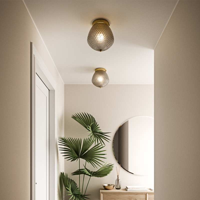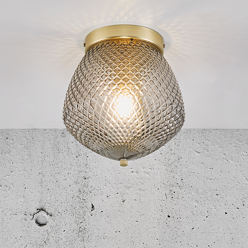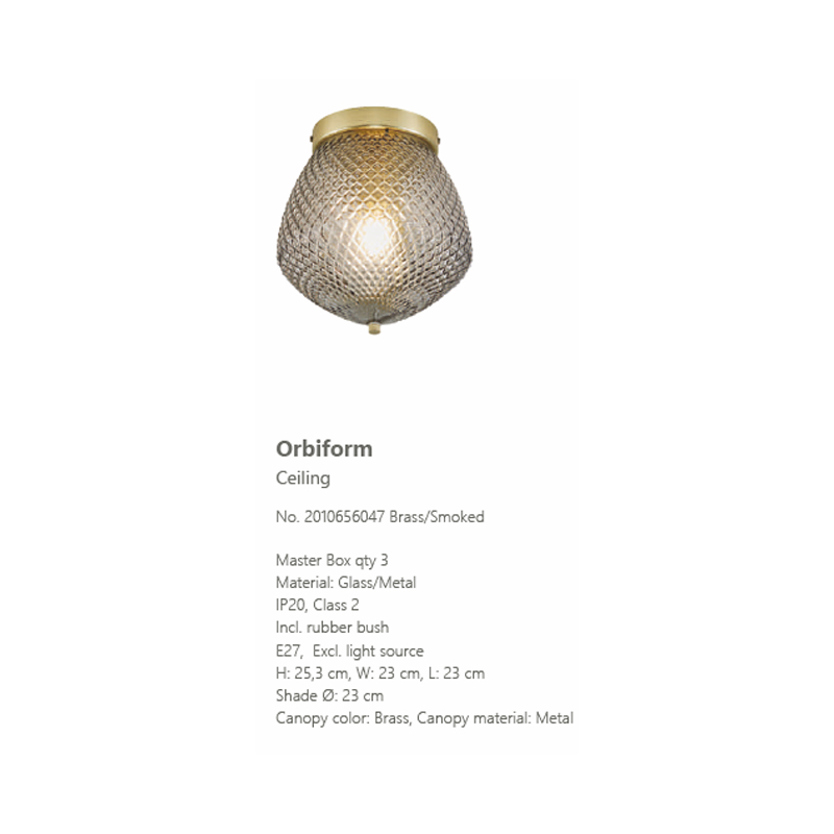 Product Code: 6N2010656047 Light source: 1 x E27 Materials: Metal, Glass Dimensions: Ø 230mm x H 253mm The Orbiform is an exclusive, stylish and glamorous design with structured smoke glass that creates a beautiful light effect and brass accents. Globe not included Designed in Denmark. IP20