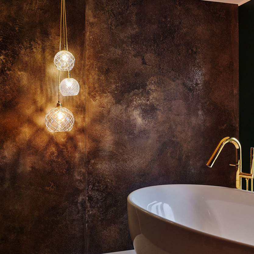 A blend of mouth-blown glass and metal finishes in a variety of colours.