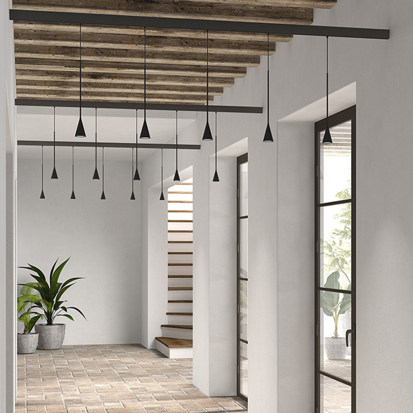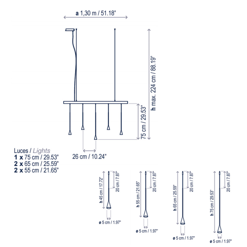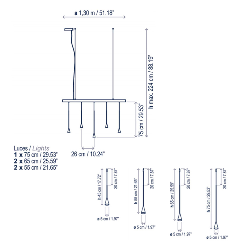 Product Code: 6B35711219056 Light source: 14W LED (entire piece) 30 degree angle beam each at 2700K Materials: Iron/Aluminium Dimensions: H 2240mm x L 11300mm Brand: Bover Skybell is an extensive system of light structures designed to adapt to any type of application. The main characteristic being freedom due to the combined variations available. The individual pendant itself is available in 4 sizes and in an assortment of arrangements. Made & designed in Spain by Estudi Manel Molina. **This linear features 5 lights TRIAC dimmable IP20