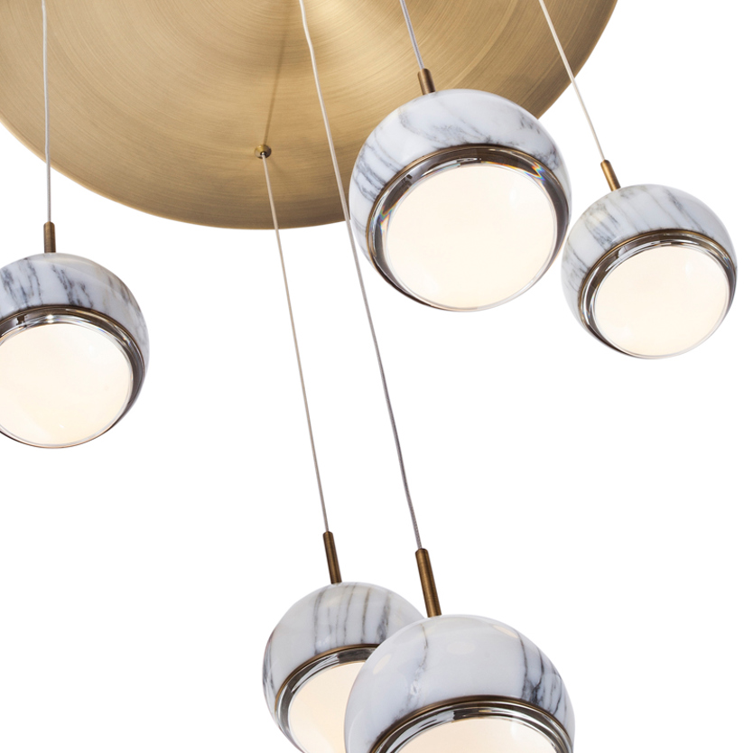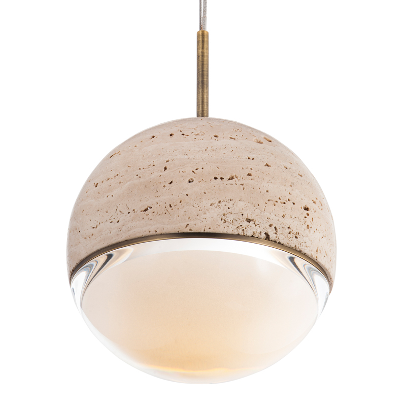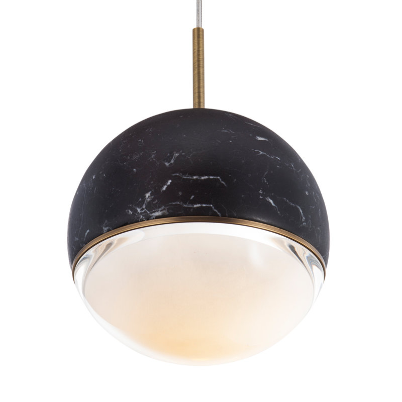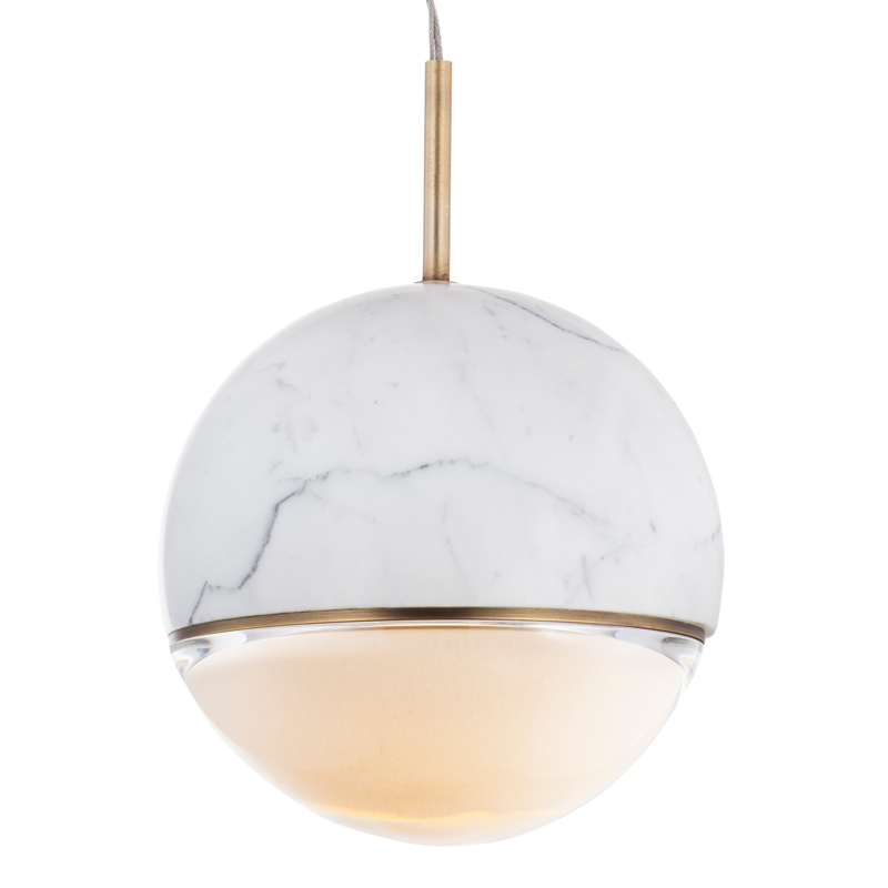 Product Code: 6VSM.07.351.xx Light source: 1 x LED 5.5W | 440lm | 3000K | Dimmable on request Materials: European marble, Bronze and metal. Dimensions: Ø 110mm | Cable Length 2700mm Brand: Viso European marble top interior pendant with cast glass diffuser lens and hairline bronze metal details.Winner of the German Design Award 2018. Designed by Filipe Lisboa. Designed and made in Canada. Two sizes available in Carrara White marble (matte or polished), Nero Marquina polished marble, Travertine & polished Indian marble(price varies). Cluster options also available. IP20