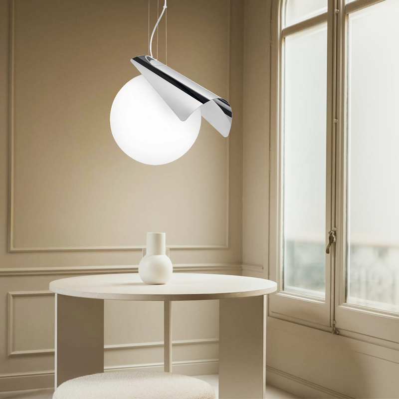 Product Code: 8I176642 Light source: 1 x E27 60W (Max) | Not Incl. Materials: Glass, Metal Dimensions: Ø 280mm x H 430mm | 1300mm Max Hang Height Brand: Ideal Lux Elevate your interiors with the striking Penombra pendant light by Ideal Lux. Featuring a sleek chrome-plated metal shade that partially envelops a luminous glass sphere, this design creates a perfect balance of light and shadow. Rated IP20 suitable for indoor use. Dimmable with dimmable globe. Designed by Ideal Lux in Italy.