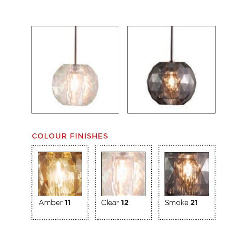 Product Code: 6VMM.07.921.xx.x Light source: 1 x G4 LED 3.5W (Max) | Not Incl. Materials: Crystal, Metal Dimensions: Ø 100mm | 2000mm Cable Suspension Brand: Viso These prismatic crystal pendants provide a touch of glamour and sparkle, even when not illuminated. The small-scale design is perfect for bathroom vanities and bedsides, while ample suspension cable and low voltage power supply mean high-ceilings won't be an issue, with the power supply fitted inside the chromed ceiling canopy. Available in Amber, Clear or Smoke crystal.